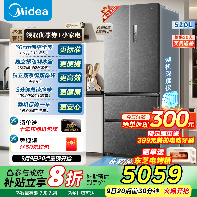 美的(Midea)M60系列520小机皇纯平全嵌法式多门四开门家用冰箱薄双系统双循环大容量BCD-520WUFPZM(E) BCD-520WUFPZM(E)幻影砂