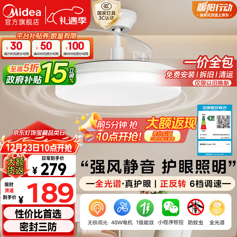 美的(Midea)风扇灯一体餐厅吊扇灯led卧室隐形扇叶三防护眼灯具熟睡风包安装