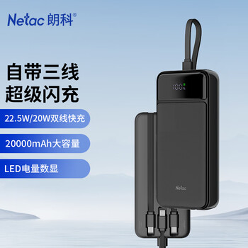 朗科(Netac)【3C认证】自带线充电宝20000毫安22.5W超级快充移动电源轻薄便携适用苹果华为小米手机可上飞机黑