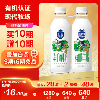 三元 极致有机鲜牛奶巴氏杀菌 900ml*2瓶 定期购 3.8g蛋白质