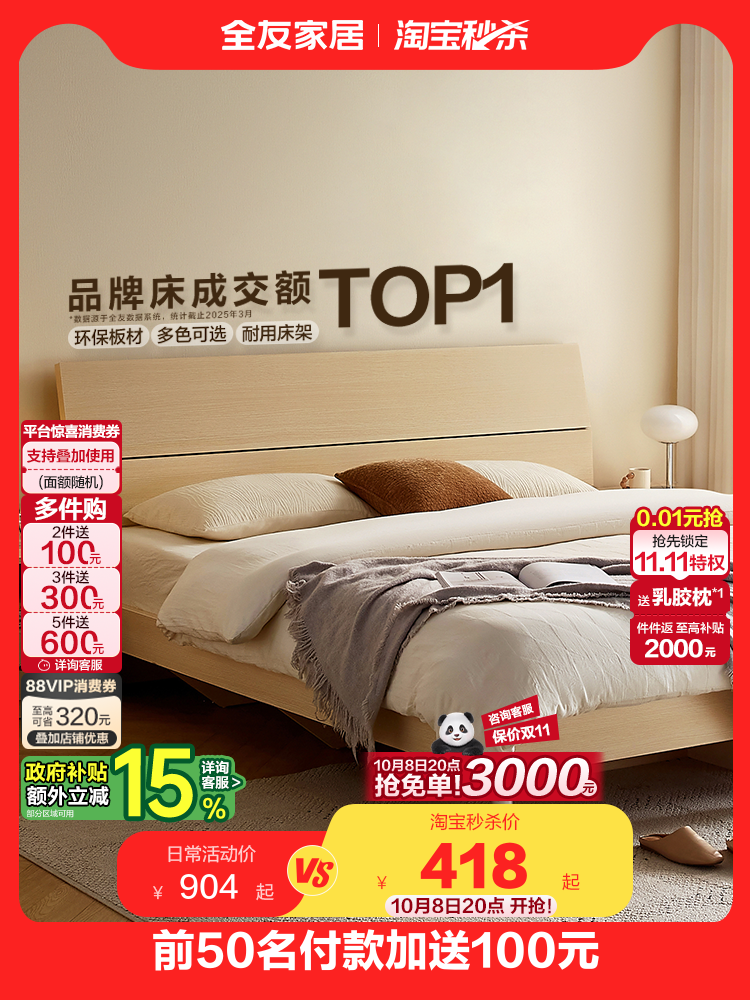 政府补贴全友家居现代简约单人床架出租房1米5卧室1米8双人大床