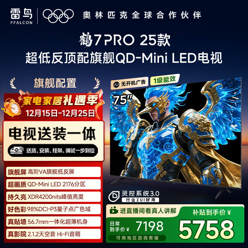 FFALCON雷鸟 【固定挂架送装一体】鹤6 PRO 25款(PLUS版) 75英寸QD-MiniLED国家补贴电视机75S595C Pro