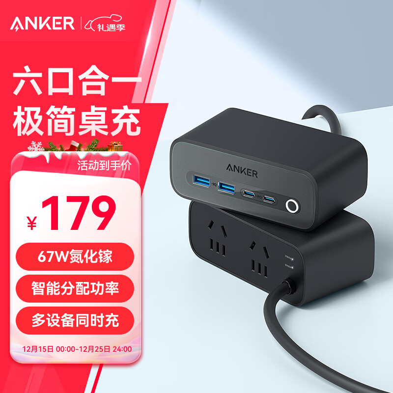ANKER安克小方盒67W桌面充电站 氮化镓插座插排多口type-c快充苹果17手机笔记本充电器桌面电源插线板黑
