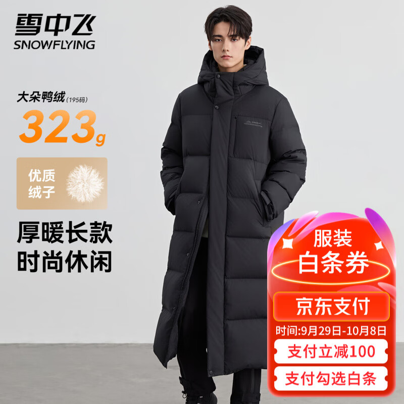 雪中飞连帽长款羽绒服男士冬季纯色帅气简约雪中飞logo防风门襟羽绒外套 黑色 L (175)