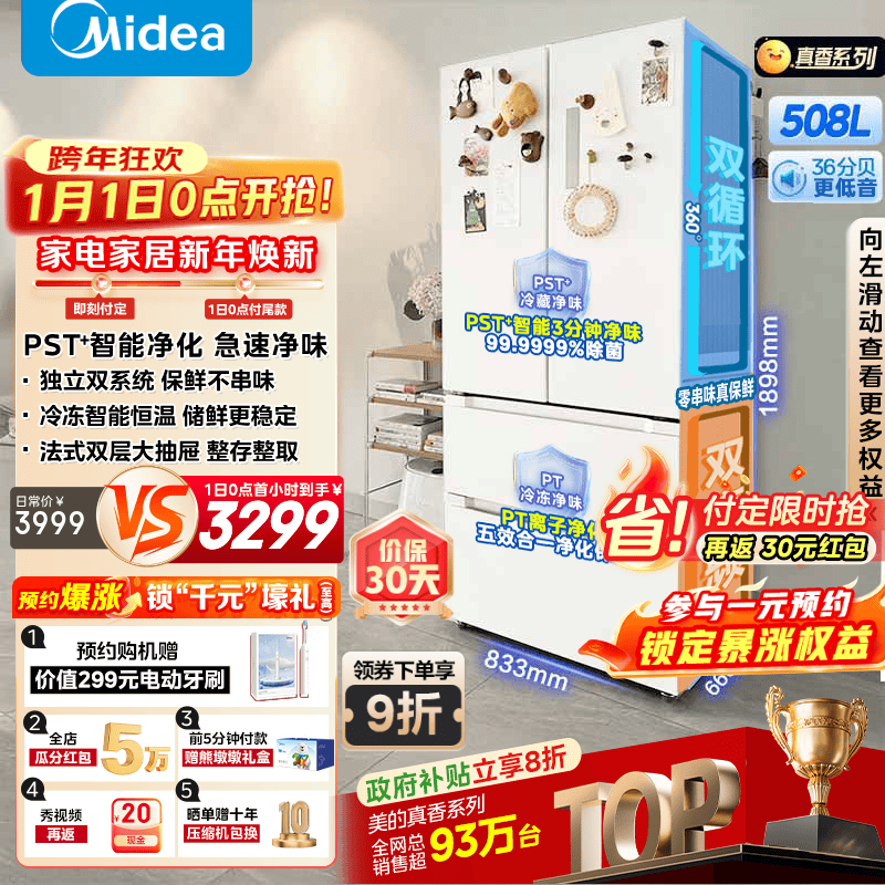 ÃÀµÄ£¨Midea£©¡¾³¬¾»¿Æ¼¼¡¿508Éý°×É«·¨Ê½¶àÃżÒÓõç±ùÏä³ý¾ú¾»Î¶Ë«ÏµÍ³¼Òµç¹ú¼Ò²¹ÌùÕæÏãϵÁÐ BCD-508WTPZM(E)