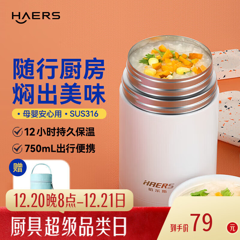 哈尔斯 焖烧杯316不锈钢焖烧壶焖烧罐闷烧保温饭盒便当带饭盒儿童成人t 白色【配杯套+餐具】750ml