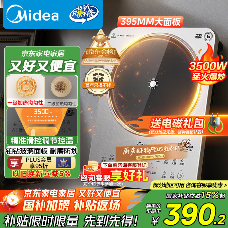 美的(Midea)铂钻家用电磁炉3500W大功率电陶炉电池炉多功能商用电磁灶一键爆炒菜烧水煮小米粥政府补贴E35C02