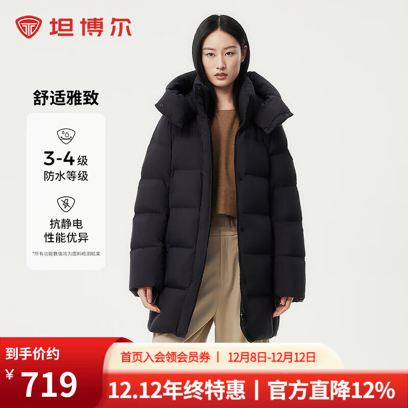 坦博尔2024冬季新款休闲百搭修身中长款脱卸帽保暖羽绒服女 黑色 3XL 185/104A