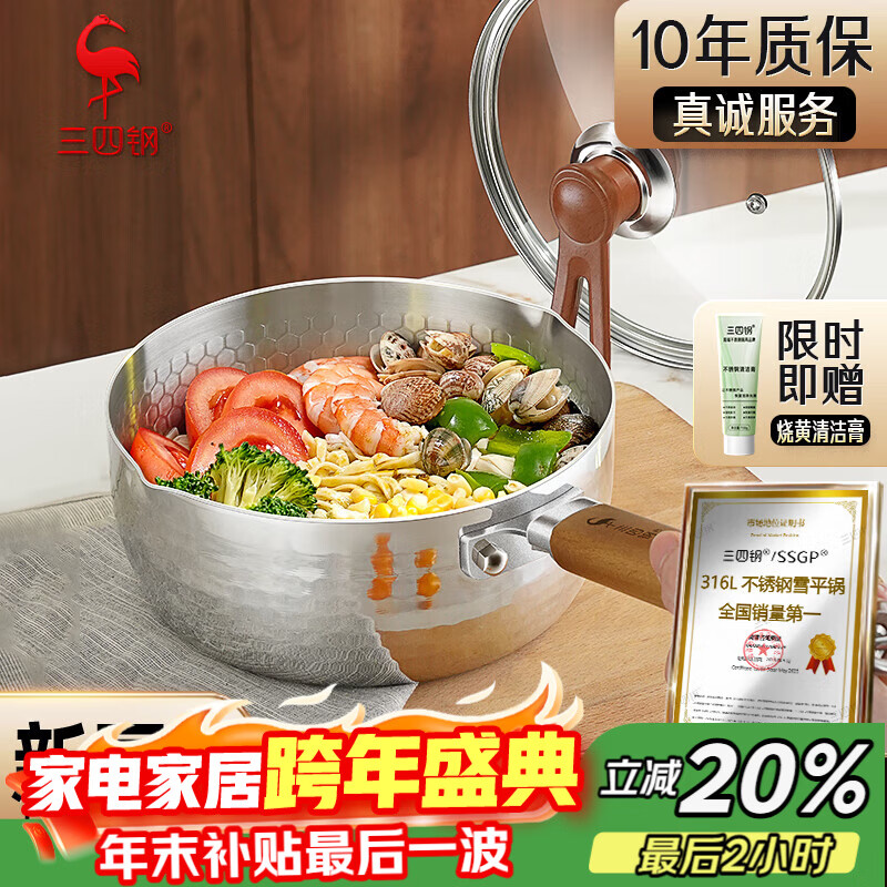 三四钢雪平锅奶锅煮泡面锅小汤锅内层316L不锈钢20cm食品级一体成型3812