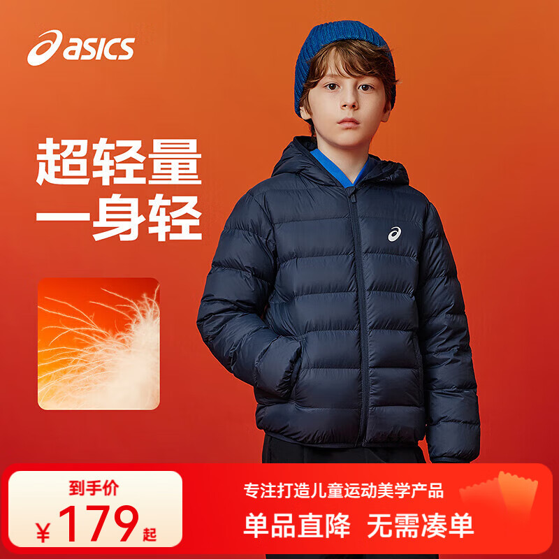 asics亚瑟士童装25年冬季儿童柔软舒适三防轻量保暖羽绒服【高充绒量】 藏青色 清洁度1000-鸭绒 160 充绒量98.5g
