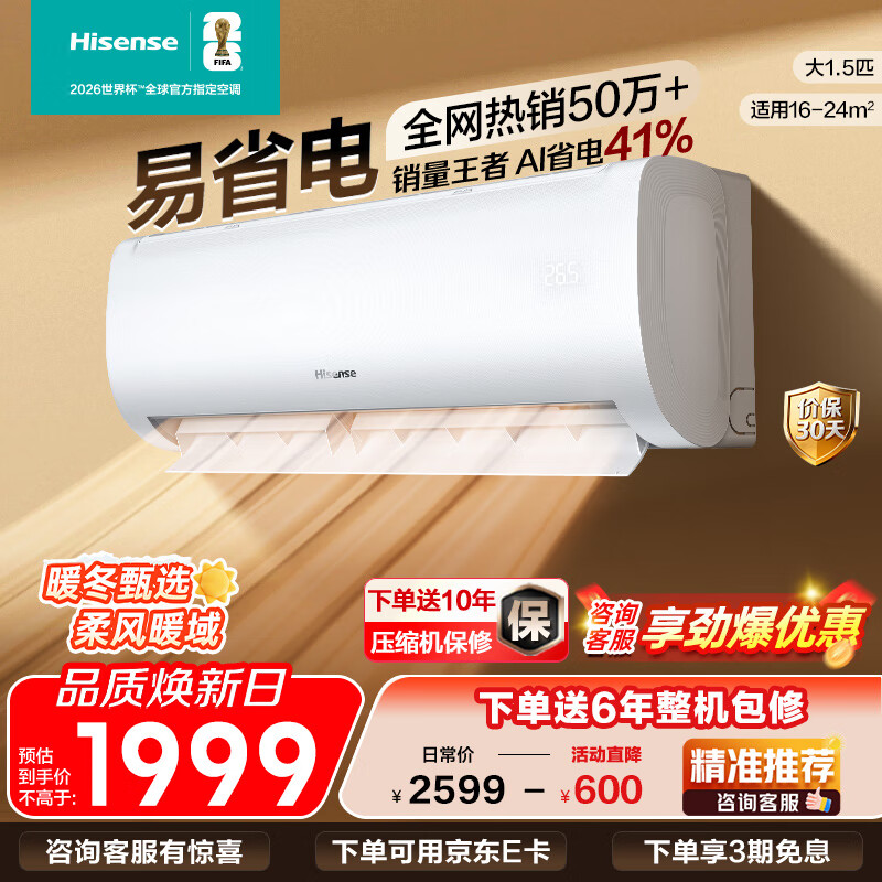 海信(Hisense)空调 大1匹/1.5匹/大2匹 易省电 AI省电 自然风大风量不直吹 新一级能效 国家补贴20%空调挂机 大1.5匹 一级能效 35GW/E370-X1