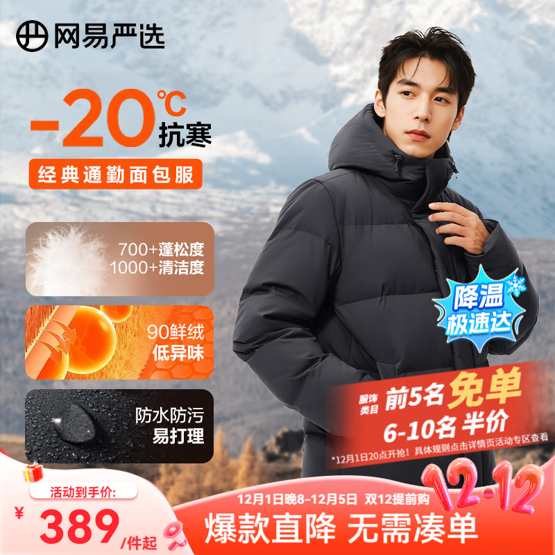 网易严选新品90鲜绒轻商务面包服连帽羽绒服男通勤-20℃抗寒无氟防水防污 A款25秋冬-连帽-砾石灰 2XL (185/104A)