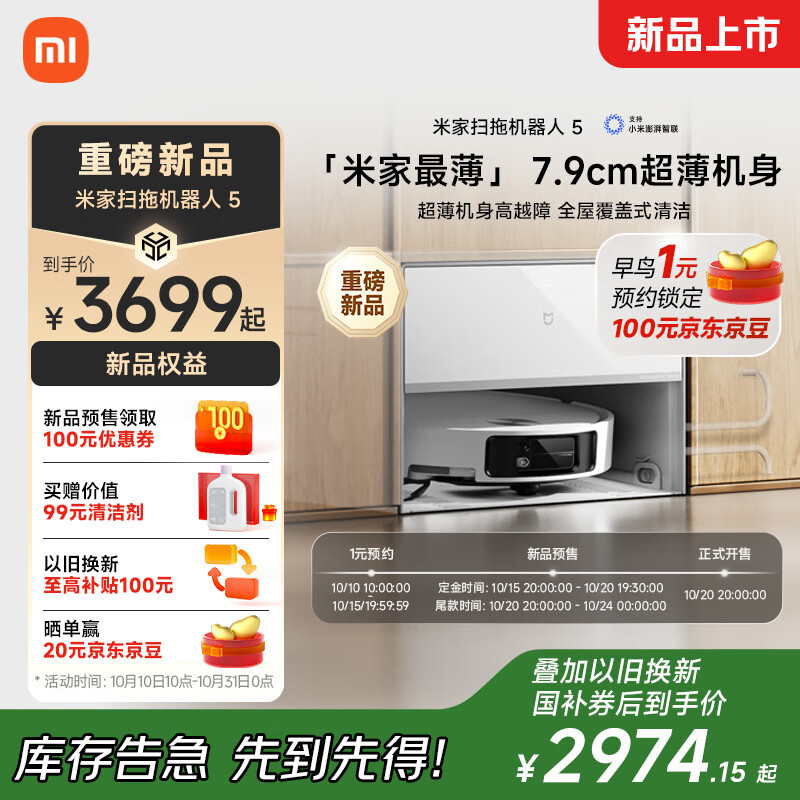 米家【10月新品】 小米扫拖机器人5 薄嵌上下水版 自清洁智能家用扫地拖地洗拖吸一体机