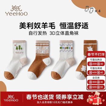 英氏4双装儿童袜子男女童秋冬加厚羊毛软糯亲肤保暖透气高弹宝宝袜 甜酷小熊 【四双装】 4双 L