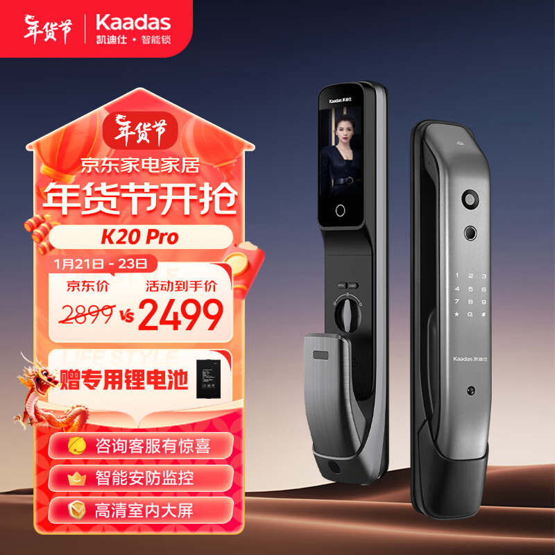凯迪仕(kaadas)K20 Pro 智能锁 指纹锁 猫眼大屏智能门锁 电子密码锁 太空灰
