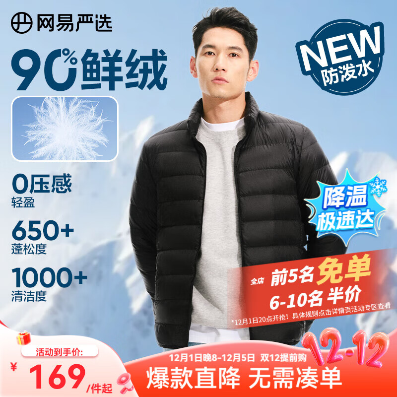 网易严选90鸭绒轻薄羽绒服保暖0压感排骨羽绒内胆防泼水蓄热抗菌外套 A款25新品90鲜绒立领-水墨黑 XL