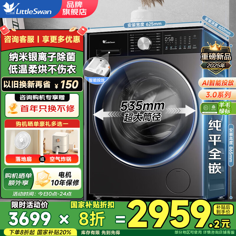 小天鹅(LittleSwan)滚筒洗衣机小乌梅3.0【小钢炮】超薄全嵌 家用全自动大容量水魔方 以旧换新国家补贴20% VE10同款 【带烘干SC08PRO轻享版】智能投放