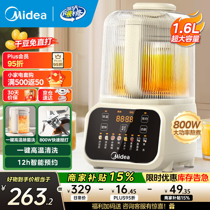 美的(Midea)安睡低音破壁机 1.6升家用全自动免滤豆浆机 柔声低至44分贝 精钢8叶强劲搅拌榨汁机 MJ-PB50T50