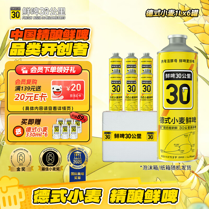 鲜啤30公里德式小麦1L*6罐 国标鲜啤 精酿原浆白啤酒 送礼聚餐 礼盒装