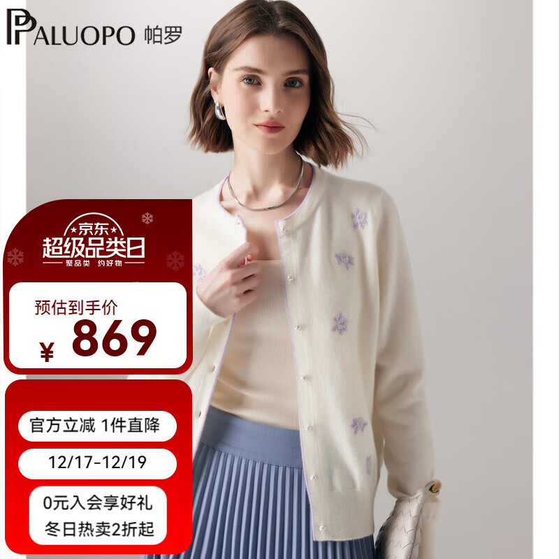 帕罗【俏皮小花】25秋冬新款针织100%山羊绒圆领开衫淑女保暖内搭毛衣 新古董白 S 155/95