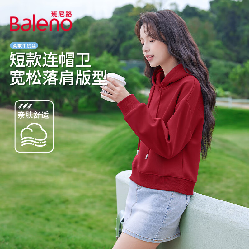 班尼路BALENO连帽卫衣女装秋冬新款宽松长袖百搭运动风小个子女生短款落肩上衣 车厘子红#纯色 L