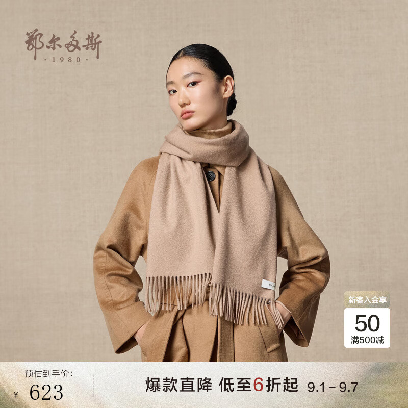 鄂尔多斯1980秋冬山羊绒保暖流苏羊绒水纹围巾180cm*30cm 驼-25 均码