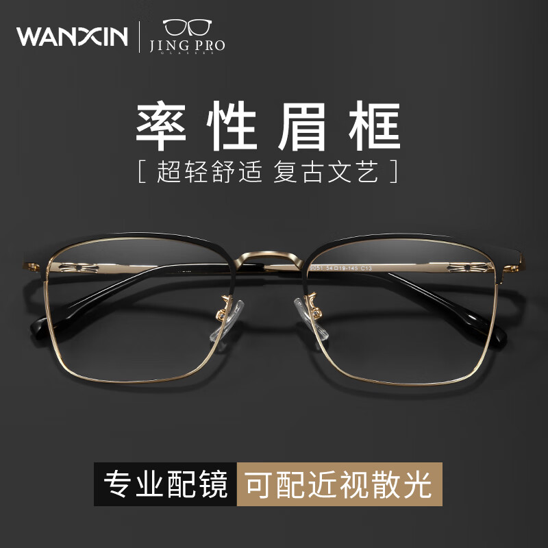 WAN XIN防蓝光眼镜框配近视镜片送男女时尚金属TK1 9051黑金 配万新1.60较薄非球面树脂镜片