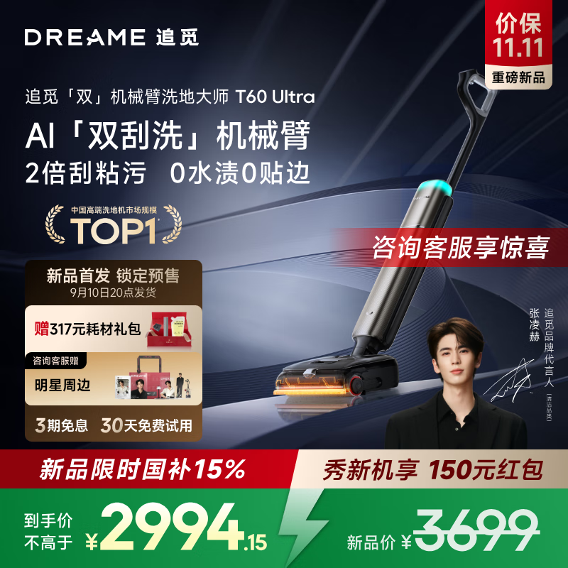 追觅T60 Ultra机械臂超薄家用洗地机 除臭泡沫洗 0缠毛0水渍0贴边拖地机 高温除菌浸泡洗
