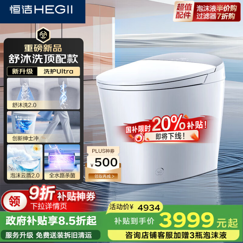 恒洁(HEGII)智能马桶H5Ultra(Max)舒沐洗自动翻盖自清洁UV除菌DCE717C-305