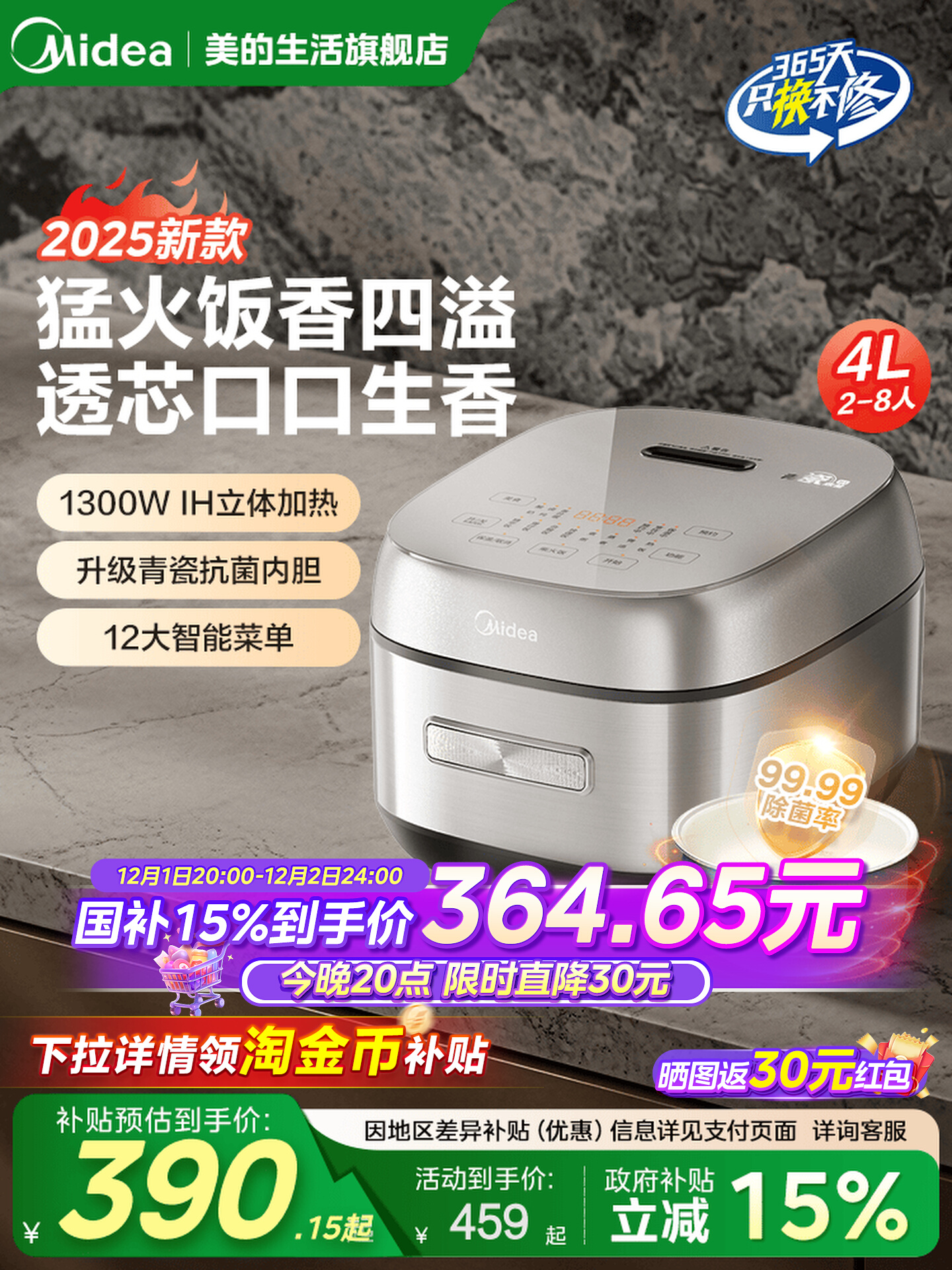 美的IH电饭煲智能多功能电饭锅煮饭不粘家用4升青瓷内胆官方正品
