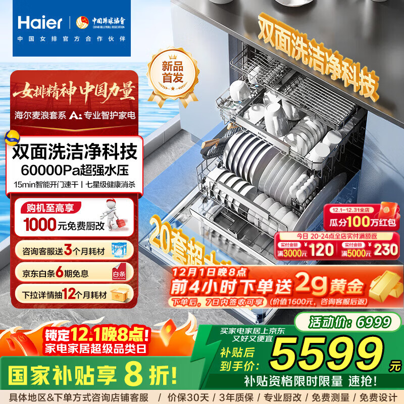 海尔(Haier)「麦浪套系」W5000Plus+ 洗碗机嵌入式双面洗20套大容量家用全自动 大水压七星级消杀10天长效净存 【双面洗洁净科技】EYBW20566GHU1钢琴黑