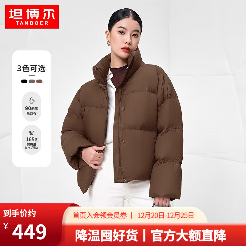 坦博尔【达人推荐】美拉德鹅绒短款羽绒服女保暖加厚外套TW236362 黑糖咖啡 S 160/84A