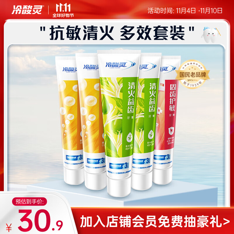 冷酸灵抗敏感牙膏量贩家庭套装5支+牙膏30g*2+软毛牙刷*2 多效合一