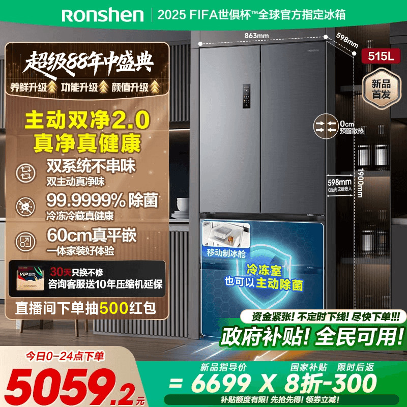 容声方糖515L主动双净双系统法式家用四开门超薄嵌入式电冰箱制冰
