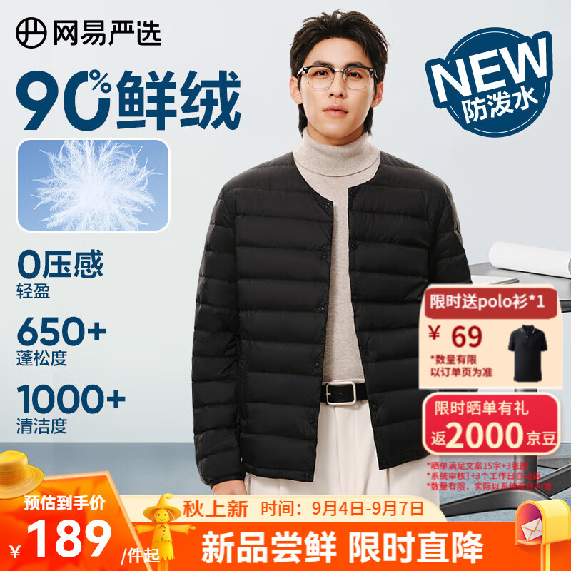 网易严选25新品90鸭绒轻暖羽绒服保暖0压感防泼水蓄热抗菌外套抗静电 A款25秋冬90鲜绒无领-水墨黑 L