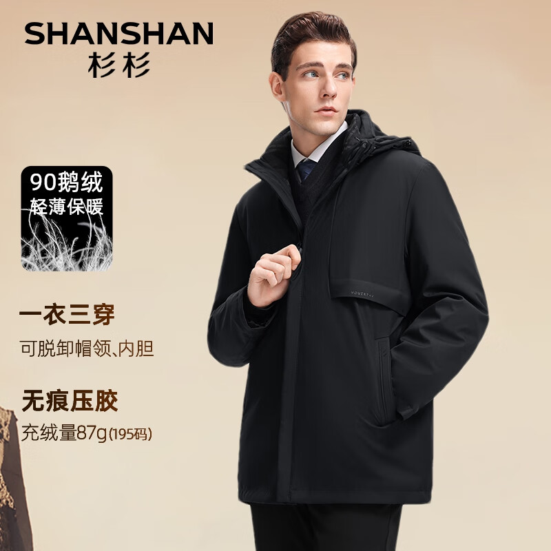 SHANSHAN杉杉鹅绒羽绒服男中长款男士一衣五穿可拆卸连帽内胆保暖御寒外套 黑色 L (175) /175