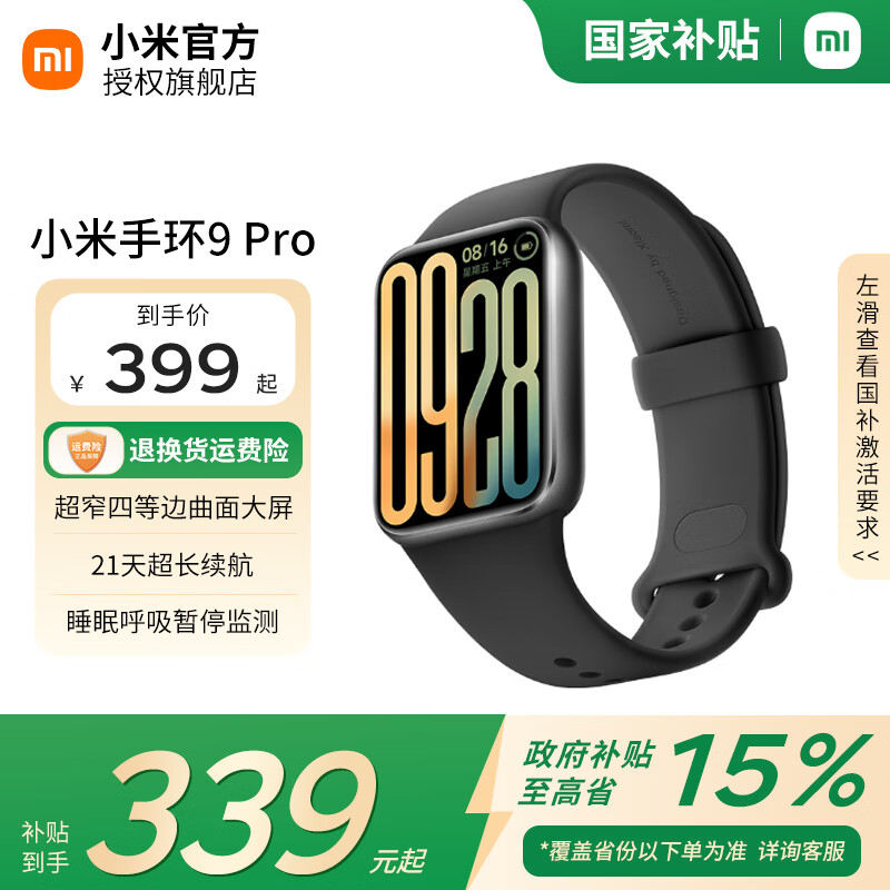小米(MI)手环9pro 智能手环 高精度运动健康 睡眠呼吸暂停监测 心率血氧监测运动手环 长续航 【国家补贴】黑色