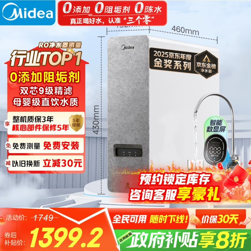 美的(Midea)国家补贴净水器家用0阻垢剂白泽1000G 长效RO反渗透 厨下式净水机过滤器直饮机净水机 智能数显