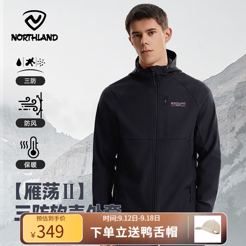 诺诗兰【雁荡】软壳外套男式防泼水徒步户外登山三防夹克外套软壳衣 纯黑色-70E男 190