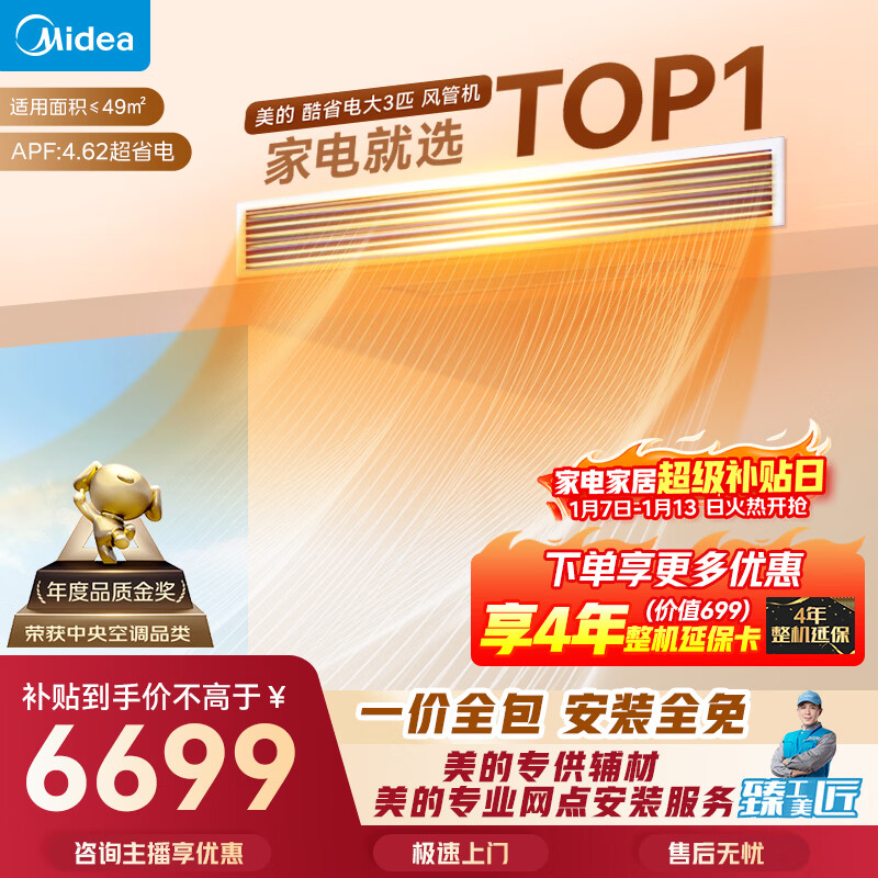 美的中央空调大3匹酷省电 风管机一拖一 超一级能效纯铜管空调 省电热销TOP1 KFR-75T2W/B3-KS(1)