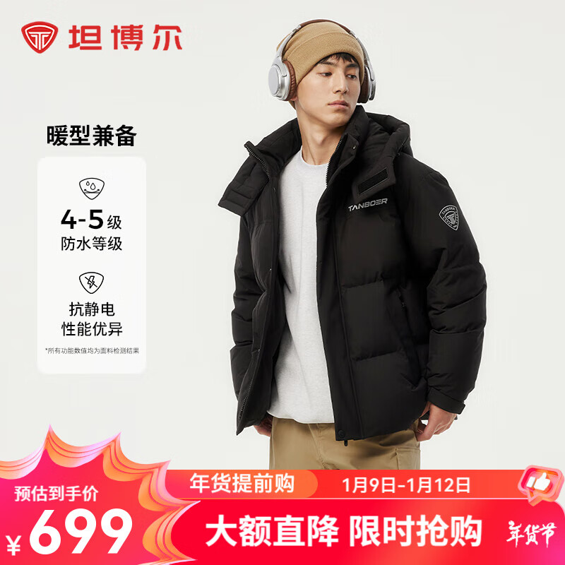 坦博尔2024新款新年红百搭羽绒服男短款休闲运动可脱卸帽加厚保暖外套 黑色 180/96A