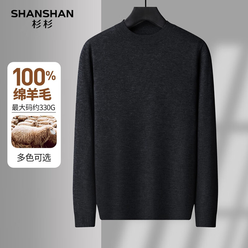 SHANSHAN杉杉纯羊毛衫100%毛衣圆领针织衫百搭打底保暖衣服商务休闲上衣男 黑灰色 L /175