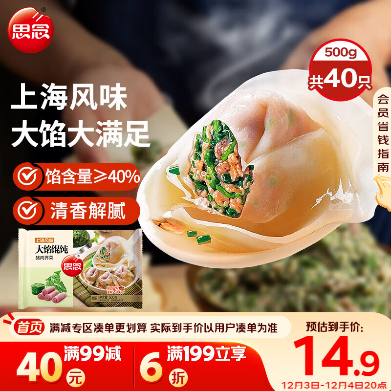 思念大馅馄饨猪肉荠菜500g40只 早餐食品速冻馄饨生鲜速食食品混沌