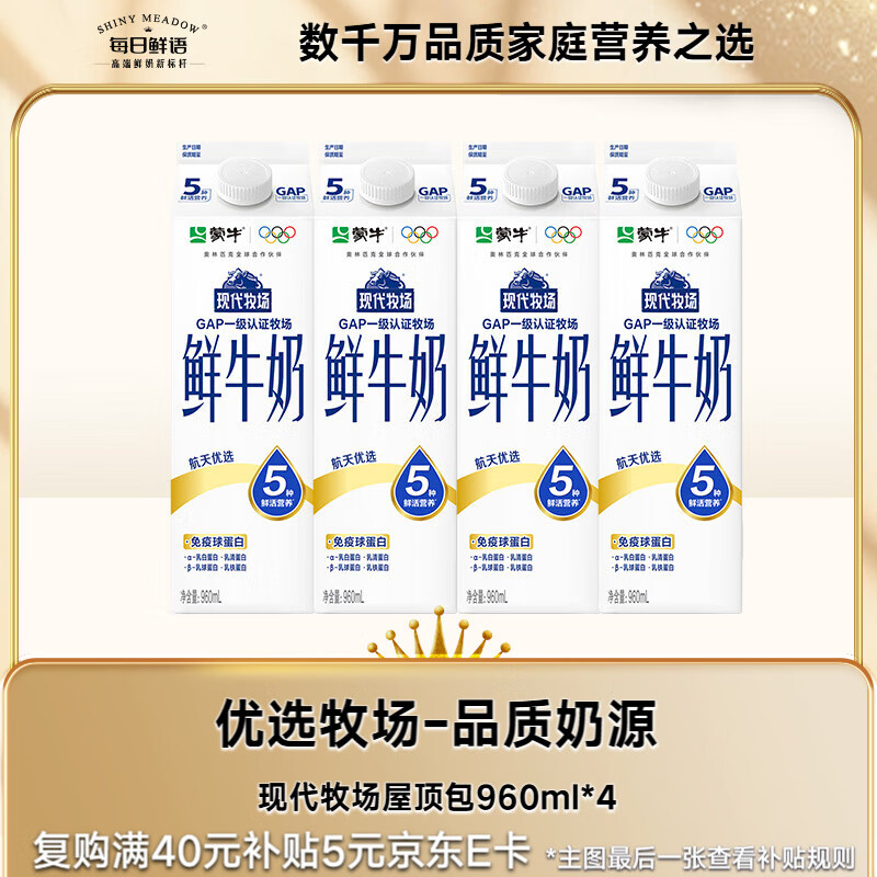 每日鲜语【PLUS补贴爆款】蒙牛现代牧场鲜牛奶960ml*4瓶 日期包新鲜