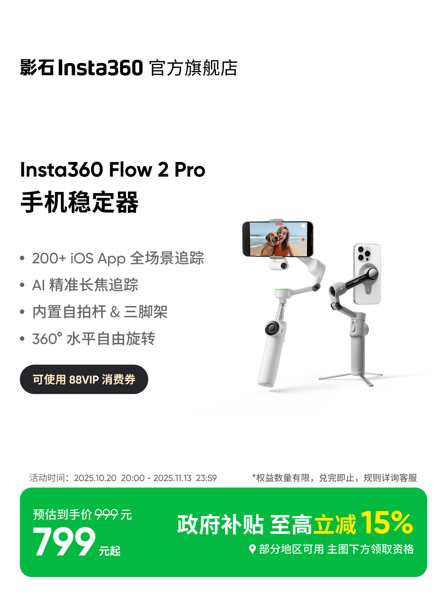 【旗舰店】影石Insta360 Flow 2 Pro手机稳定器手持云台三轴增稳ai追踪防抖视频直播便携三脚架自拍杆补光灯