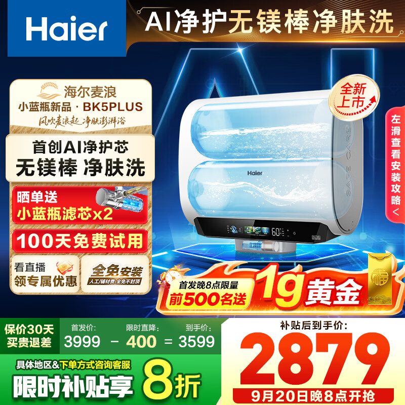 海尔(Haier)麦浪电热水器【小蓝瓶净肤洗BK5/BK5pro/BK5PLUS】富锶养肤 超薄双胆 电热水器60升 扁桶变频速热 60L 3300W 行业创新BK5PLUS