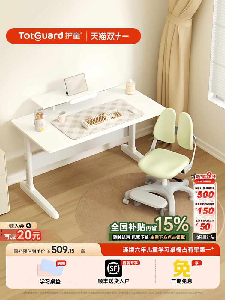 护童实木儿童学习桌可调节书桌小学生家用桌椅套装可升降大白桌