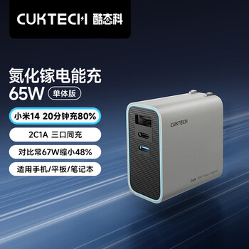 CUKTECH酷态科65W三口氮化镓充电器USB/Type-C快充头适用PD20W苹果16小米/华为/三星/Macbook/笔记本电脑