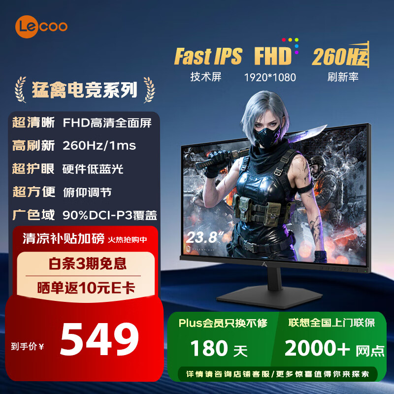 Lecoo联想来酷23.8英寸260Hz超频硬件低蓝光FastIPS400亮度1ms广视角窄边框电竞显示器N2456S