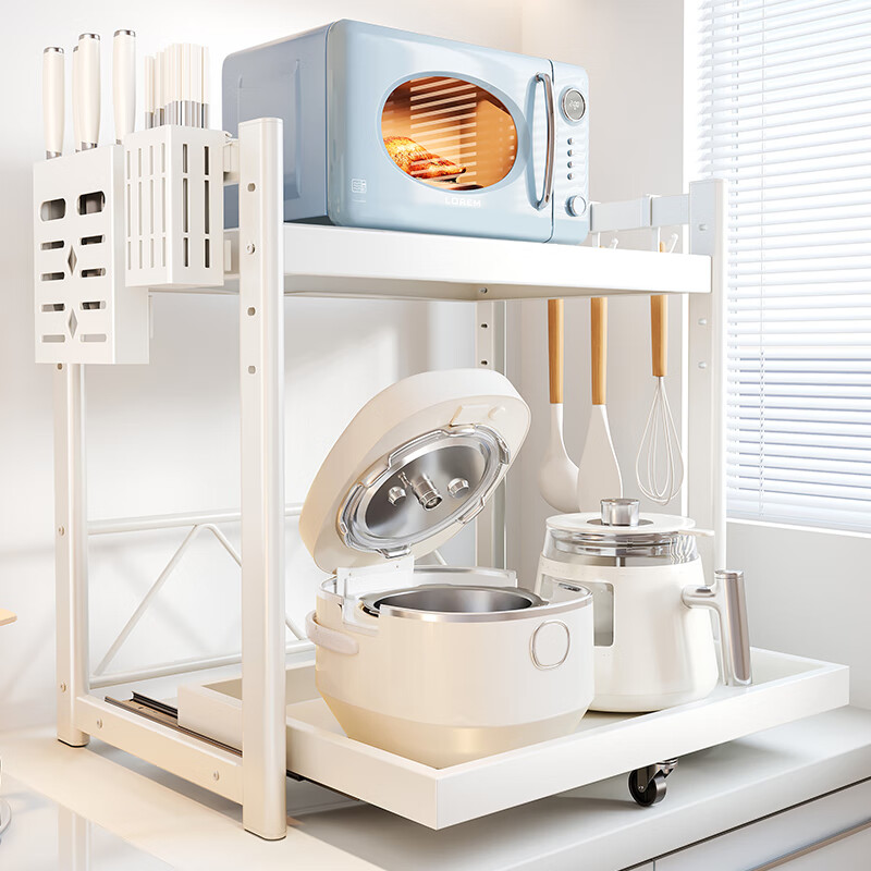 四季沐歌厨房用具微波炉置物架台面电饭煲锅收纳架可抽拉烤箱架空气炸锅架 【奶白-抽拉款】53cm层高可调